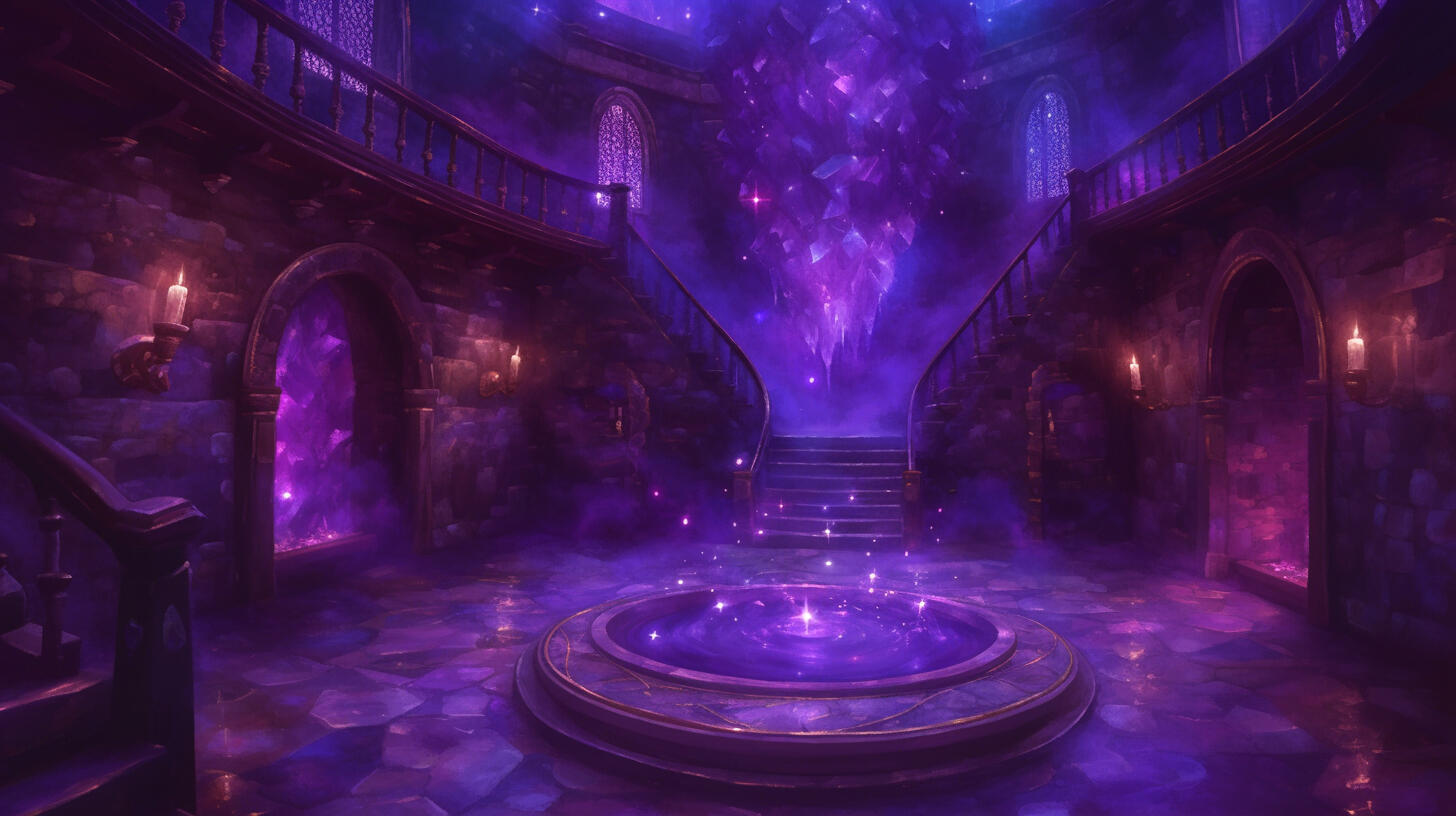 A dreamlike haze fills the Amethyst Tower, its twisting halls and spiraling staircases shrouded in soft violet mist. Time feels elastic here, with echoes of distant whispers lingering in the air. The main chamber is circular, lined with glowing amethyst crystals that pulse faintly, seemingly alive. Floating orbs of light drift through the space, casting shifting shadows that mimic constellations. Meditation alcoves are carved into the walls, offering seers a place to gaze into pools of shimmering liquid amethyst, which reveal cryptic visions of the future.