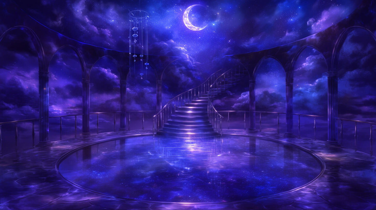 Suspended in the sky, the Sapphire Dome is a celestial sanctuary of dreams and mysteries. The interior glows with faint moonlight, and the floor appears as an endless expanse of stars. Circular walkways hover above this void, leading to chambers enclosed by translucent sapphire walls. The main hall is dominated by a shimmering pool that reflects the subconscious of those who gaze into it. Wind chimes crafted from sapphire fragments tinkle softly, adding a melodic backdrop to the dreamlike ambiance.