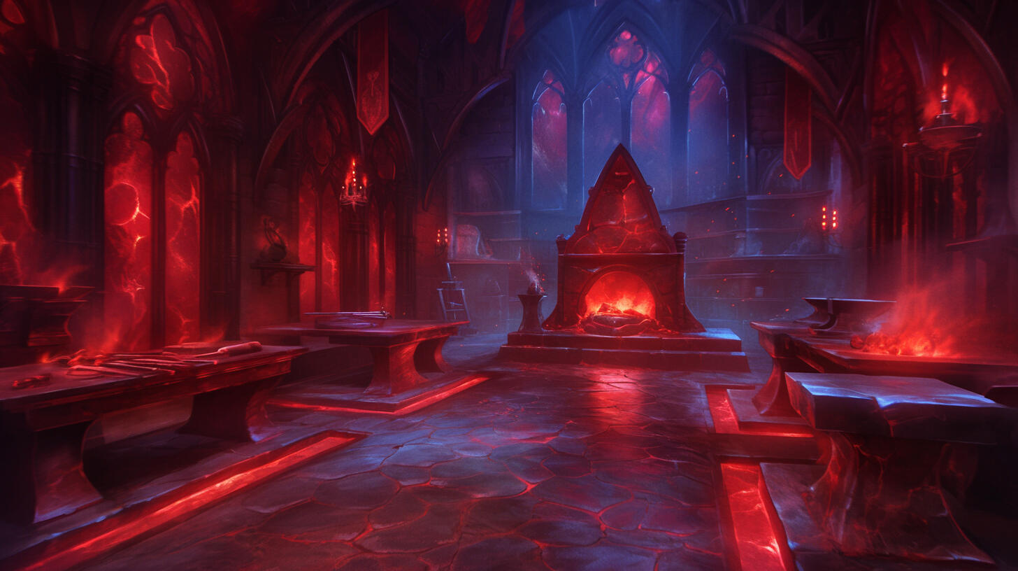 The Garnet Forge radiates warmth and intensity, its walls carved from glowing, molten garnet. The air is filled with the sound of crackling flames and the rhythmic pounding of hammers. The main chamber features a grand forge surrounded by tools and materials for crafting. Lava flows through channels carved into the floor, providing both light and heat. Artisans display their creations on pedestals of blackened stone, each piece imbued with the fiery passion of its maker.