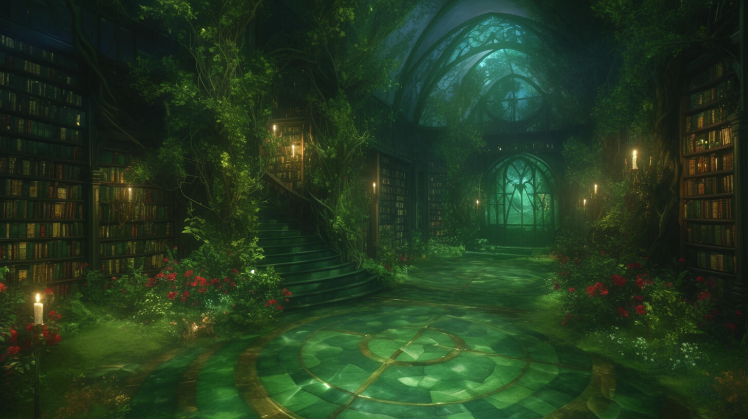 The Emerald Library is a vast, verdant expanse where knowledge and nature intertwine. Towering bookshelves of carved emerald stretch to the ceiling, filled with ancient tomes and scrolls. Lush vines and blooming flowers grow between the shelves, releasing a soothing fragrance. The central reading hall is illuminated by soft green light, with intricate mosaics of Gemvara’s history inlaid into the floor. Study alcoves are nestled among the greenery, offering scholars solitude to ponder the mysteries of the world.