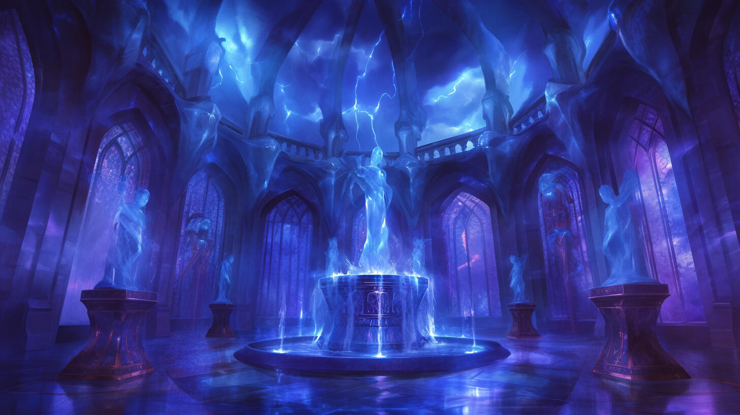 The Aquamarine Citadel is a stormy, dynamic space where the air crackles with energy. Walls of translucent aquamarine seem to ripple like water, and the ceiling shifts between stormy clouds and clear skies. Chambers are open and airy, with fountains and cascading water creating a constant symphony of sound. Lightning occasionally arcs between sculptures of storm spirits, illuminating the space. A central altar channels the power of wind and rain, serving as a focus for the Aquamarines’ storm-calling abilities.