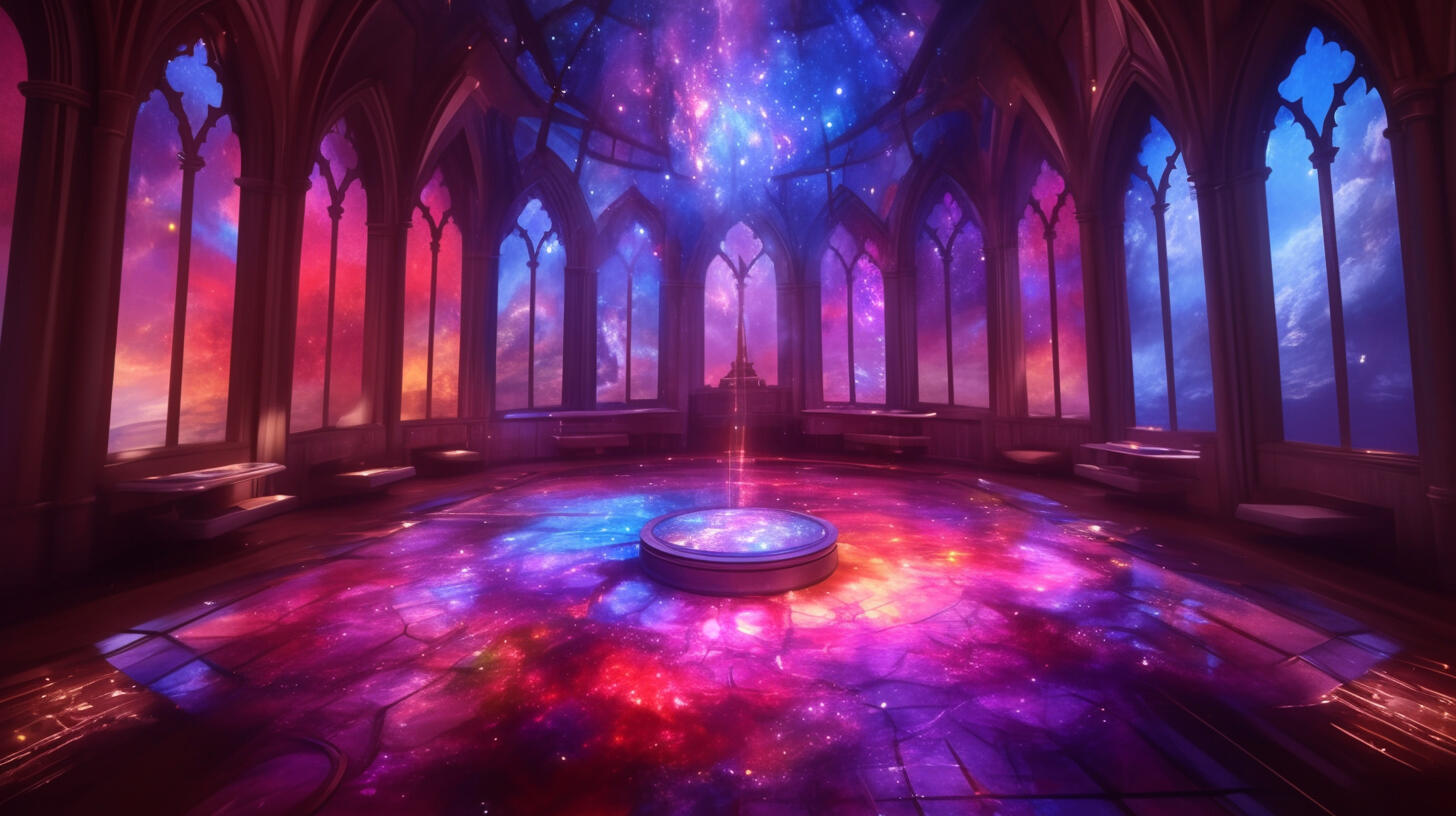 Atop the highest spire of the Nexus, the Opal Observatory is a kaleidoscope of shifting colors. The walls and ceiling are transparent, offering an unbroken view of the cosmos. A central platform holds a massive opalescent lens used to study celestial phenomena. The floor is an ever-changing mosaic of light, responding to the stars above. Floating platforms provide seating and observation points, and the air is filled with the hum of celestial energy.