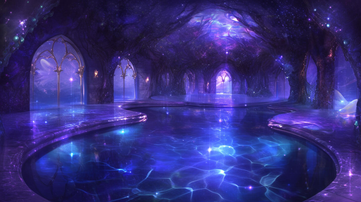 Suspended in the sky, the Sapphire Dome is a celestial sanctuary of dreams and mysteries. The interior glows with faint moonlight, and the floor appears as an endless expanse of stars. Circular walkways hover above this void, leading to chambers enclosed by translucent sapphire walls. The main hall is dominated by a shimmering pool that reflects the subconscious of those who gaze into it. Wind chimes crafted from sapphire fragments tinkle softly, adding a melodic backdrop to the dreamlike ambiance.