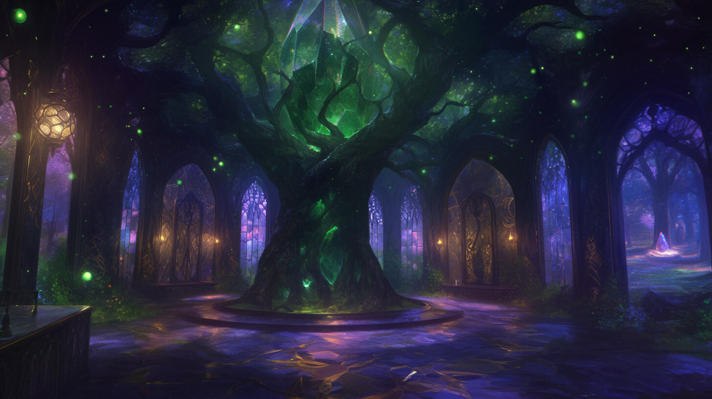 The Chrysoberyl Grove is more forest than tower, its halls formed by towering trees with crystalline, cat’s-eye-patterned bark. The air is filled with the sounds of rustling leaves and distant animal calls. Rooms are hidden within the natural formations, accessible through shifting pathways that seem to respond to the visitor’s intent. Glowing orbs of golden-green light float gently through the space, illuminating murals of Gemvara’s wilds. A central atrium houses a massive, glowing chrysoberyl crystal that hums with primal energy, serving as a focal point for shapeshifting rituals.